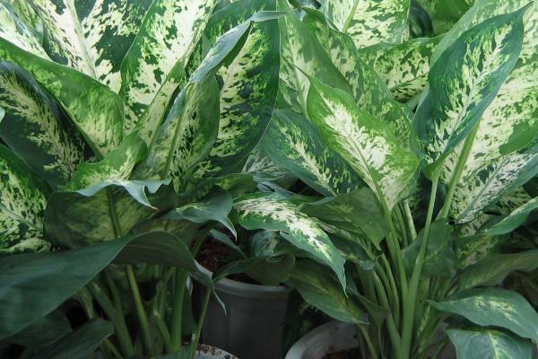 (3)宽大的叶片两面深绿色,其上镶嵌着密集、不规则的白色、乳白、淡黄色等色彩不一的斑点,斑纹或斑块。
